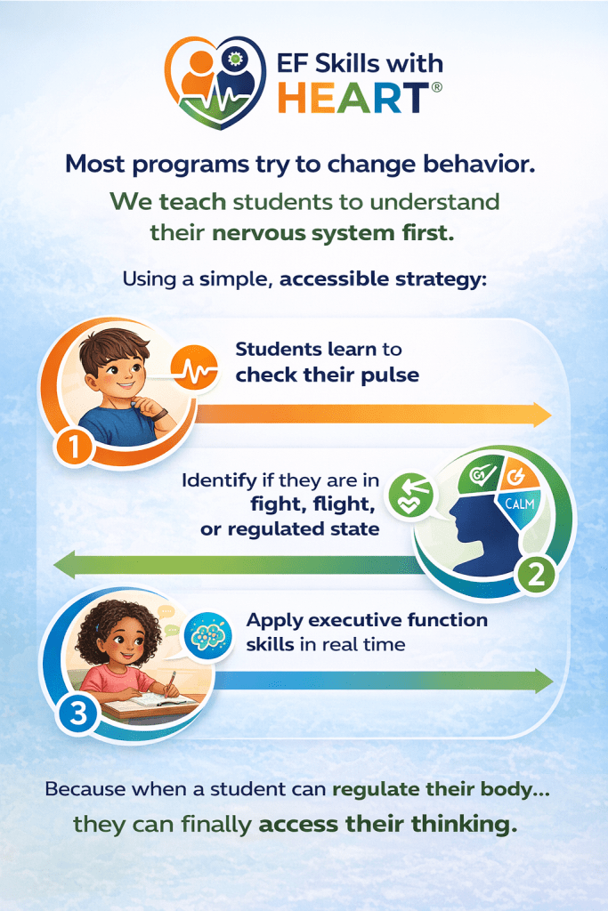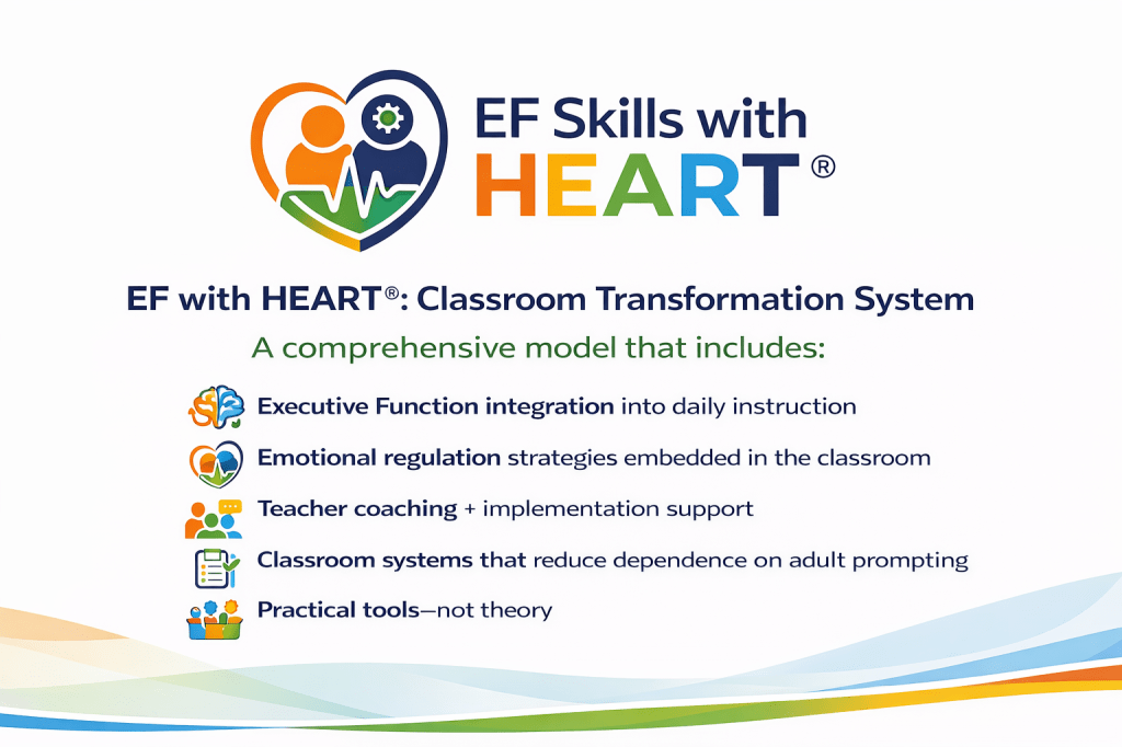 EF Skills with HEART® is a comprehensive classroom transformation system combining executive functioning, emotional regulation, and instructional alignment. Turn Tier 1, 2, & 3 funding into measurable academic growth, without adding more programs, burnout, or guesswork.